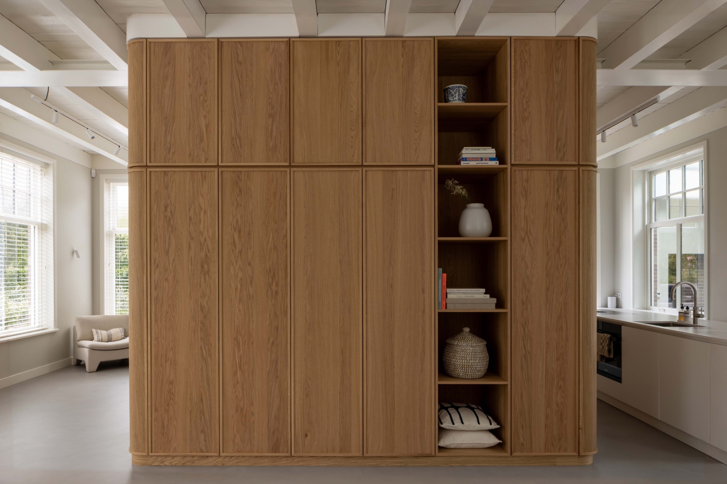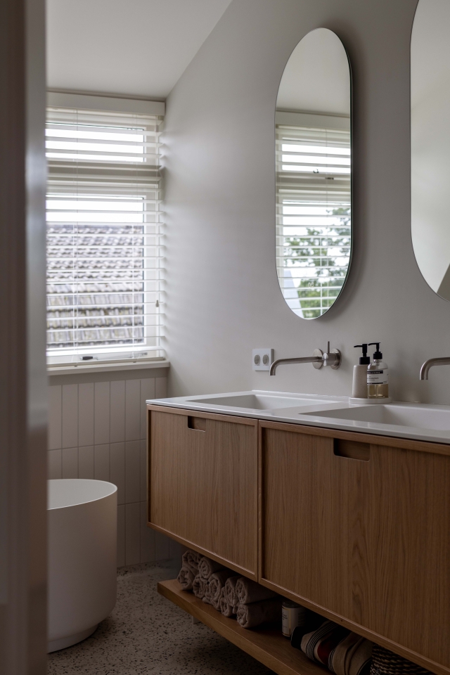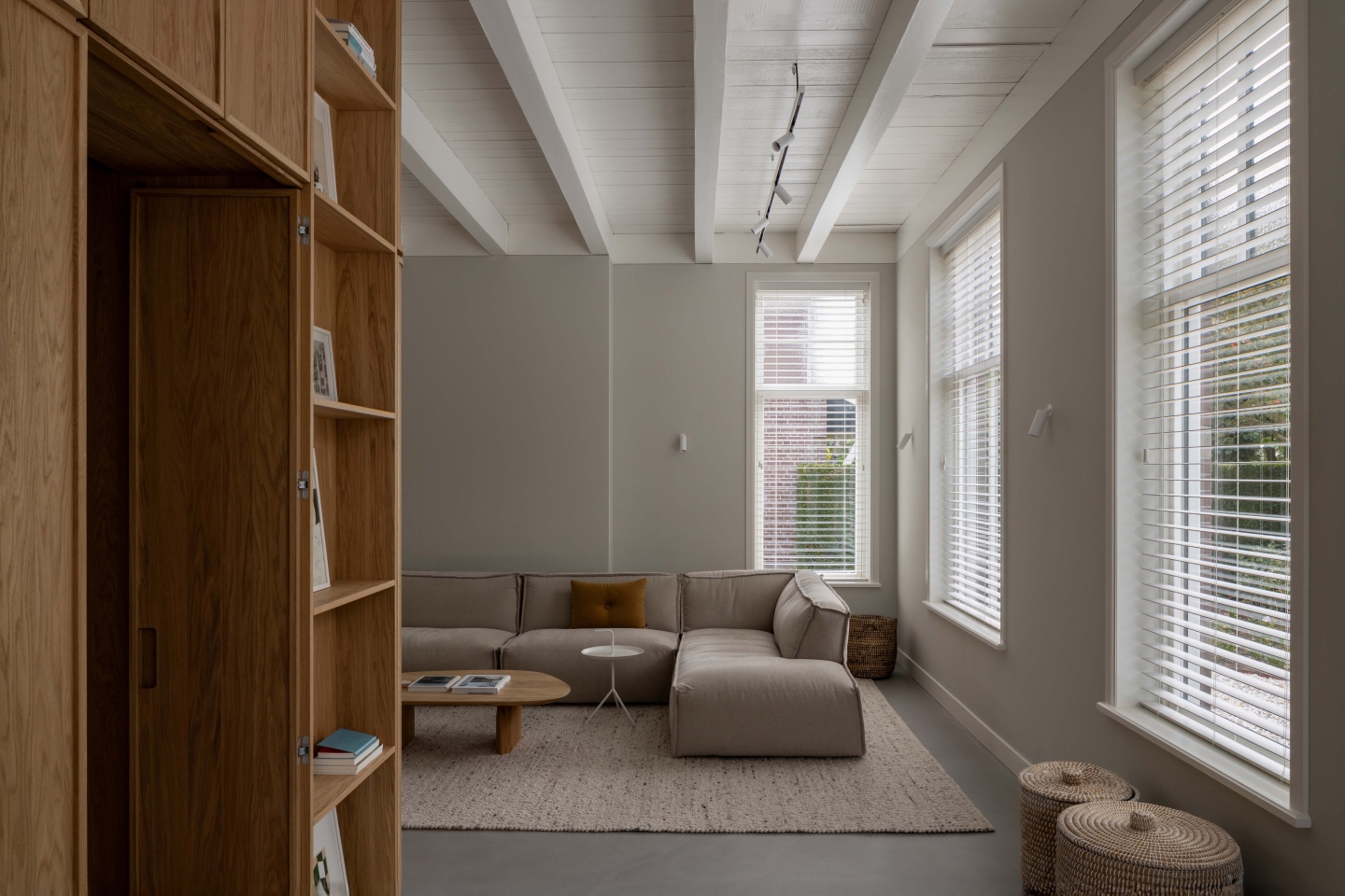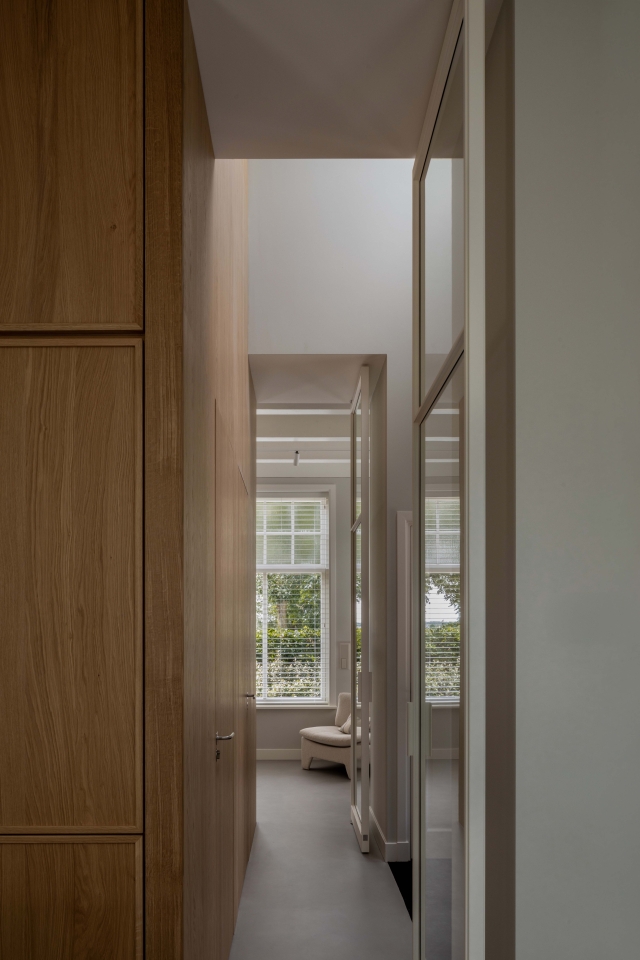 Inside, in the center of the house, a functional volume has been placed. This oak ‘furniture element’ incorporates the TV and kitchen cabinets, the toilet, and stairs leading to a basement and upper floor. The volume divides the ground floor into different areas: a kitchen with dining area, a sitting area and a workplace. From the entrance to the house, two glass pivot doors offer a view to the kitchen and living room. A double-height void provides a connection to the upper floor, allowing a view of the angled roof with skylight from the entrance. The oak staircase is ‘hidden’ behind cabinet doors and separates the sleeping area on the first floor. Upstairs, there are three large bedrooms, a laundry room and a spacious bathroom with an ‘in situ’ terrazzo floor. The roof trusses have been made visible again, significantly enhancing the sense of space on the upper level.