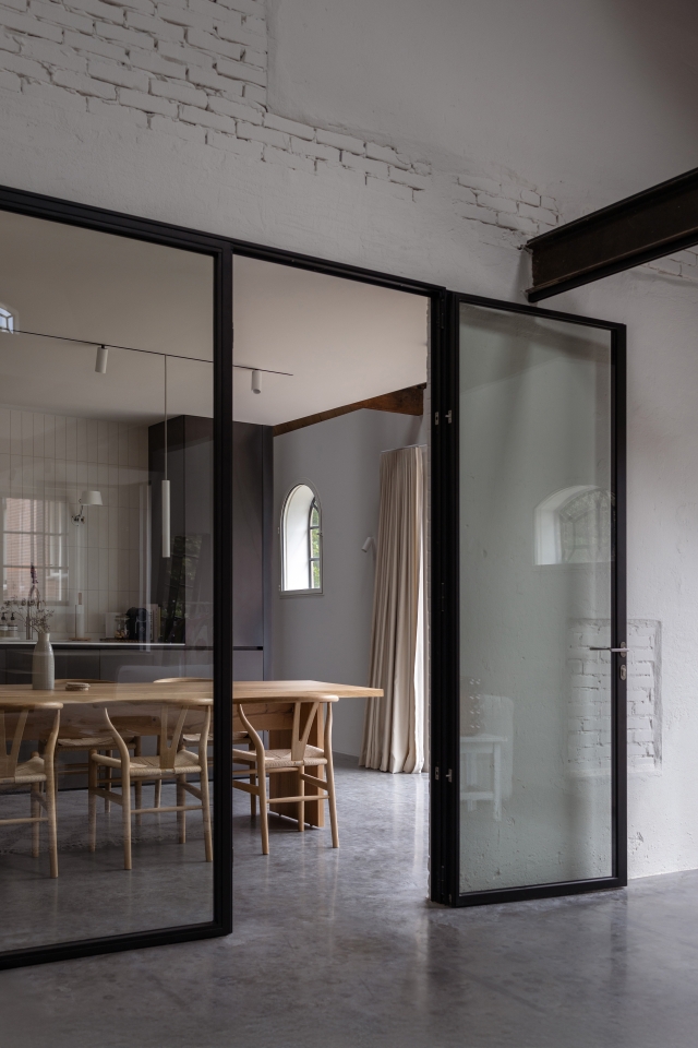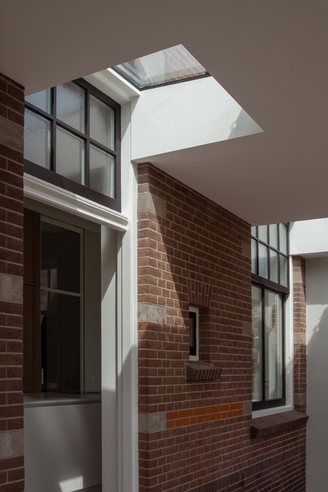 Against the rear facade of the house, a conservatory has been added, positioned a few steps lower than the ground floor of the house. The roof of the conservatory has been opened up where it meets the window openings in the existing facade. Skylights maintain the light flow through the existing window frames, creating beautiful diffuse lighting on the original brick facade. Through the conservatory, a glass tunnel connects to the adjacent former workshop, now a studio, which is again set a few steps lower.